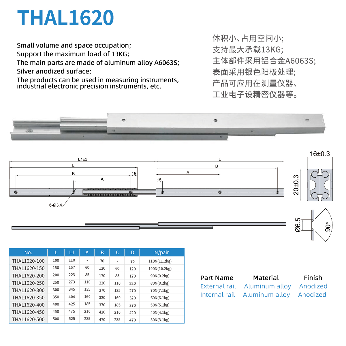 Aluminum alloy material 16mm thick 20mm wide light load slide rail Maximum load 15KG Used in office equipment, industrial electronics, medical equipment and automotive parts