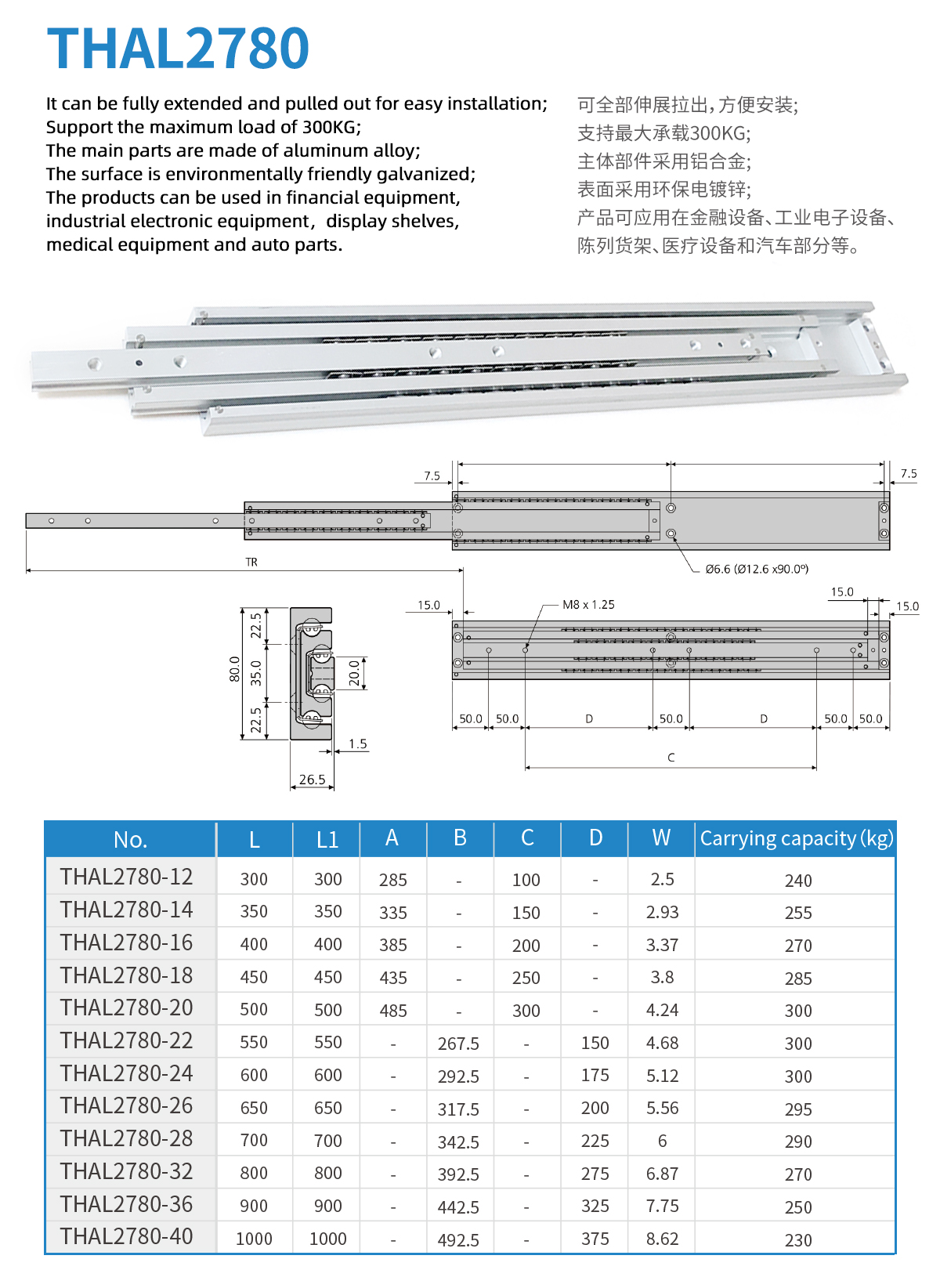 铝合金材质27mm厚80mm宽重载滑轨 最大承载300KG 用于办公设备,工业电子设备,医疗设备和汽车部分