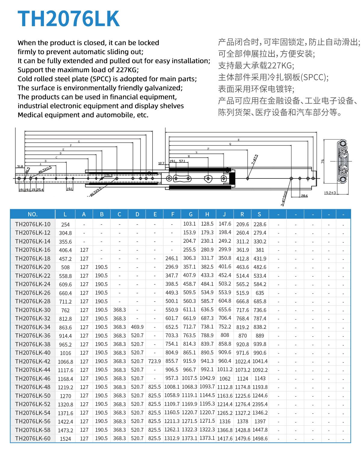 Cold-rolled steel material 19mm thick 76mm broadband lock heavy-duty slide rail maximum load 220KG Used in office equipment, industrial electronics, medical equipment and automotive parts