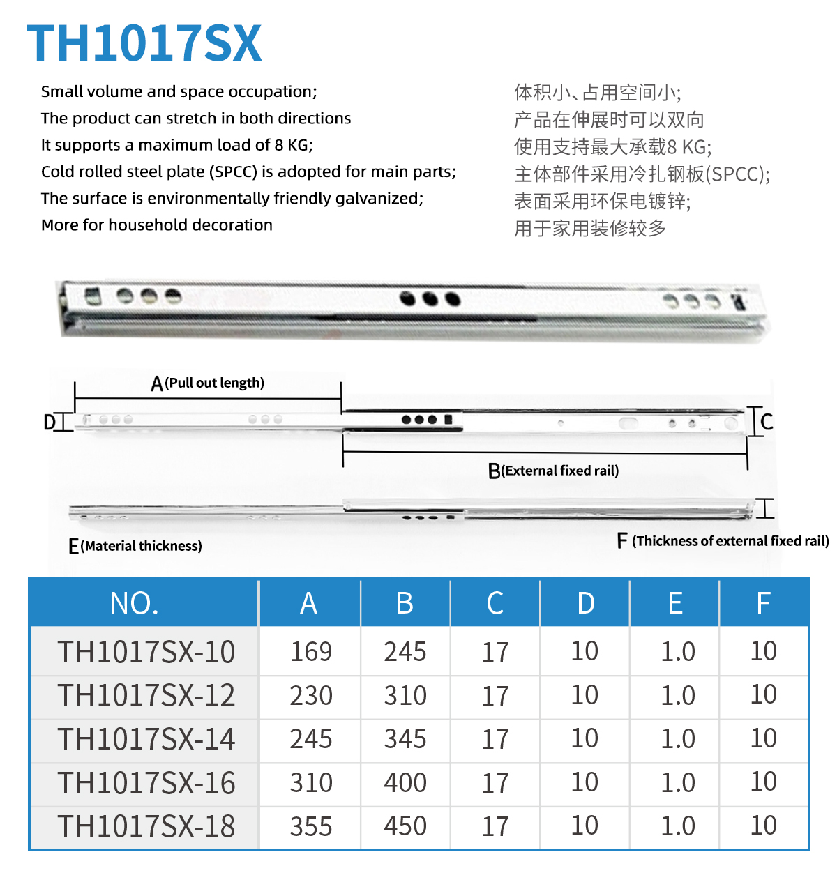 Cold   rolled steel material 9.6mm thick 17mm wide bidirectional light load slide   rail Maximum load 15KG Used in office equipment, industrial electronic   equipment, medical equipment and automotive parts