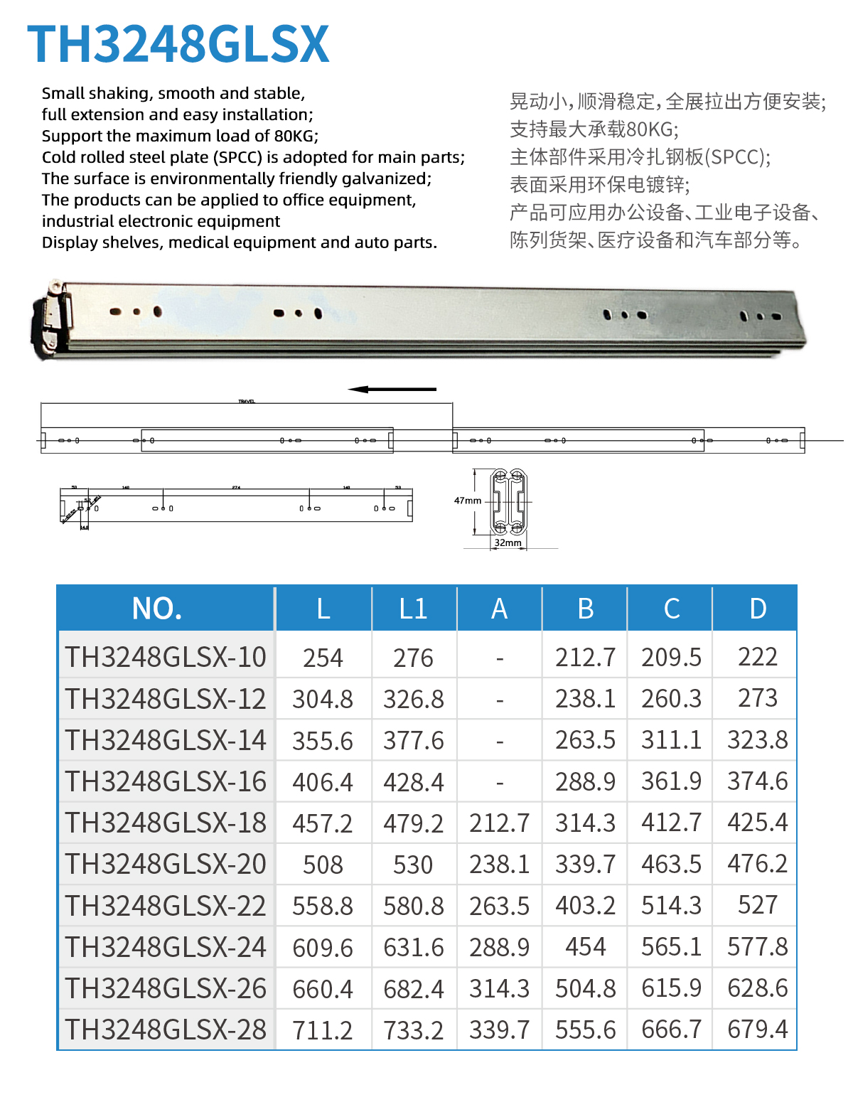 Cold   rolled steel material 32mm thick 48mm wide roller bidirectional heavy duty   slide rail Maximum load 80KG Used in office equipment, industrial   electronics, medical equipment and automotive parts