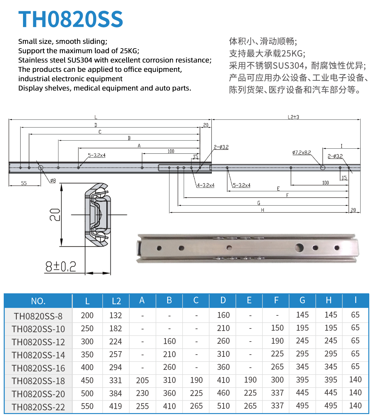 Stainless steel 304 material 8mm thick 20mm wide light load slide rail Maximum load 15KG Used in office equipment, industrial electronics, medical equipment and automotive parts