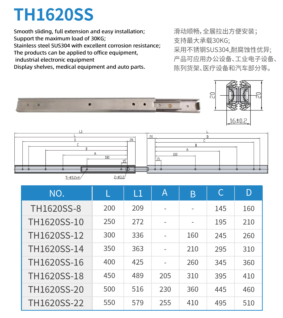 Stainless steel 304 material 16mm thickness 20mm wide light load slide rail Maximum load 25KG Used in office equipment, industrial electronic equipment, medical equipment and automotive parts