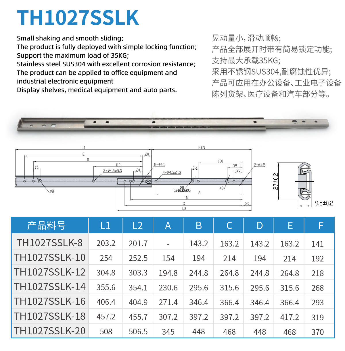 Stainless steel 304 material with lock 9.6mm thickness 27mm wide light load slide rail Maximum load 35KG Used in office equipment, industrial electronics, medical equipment and automotive parts