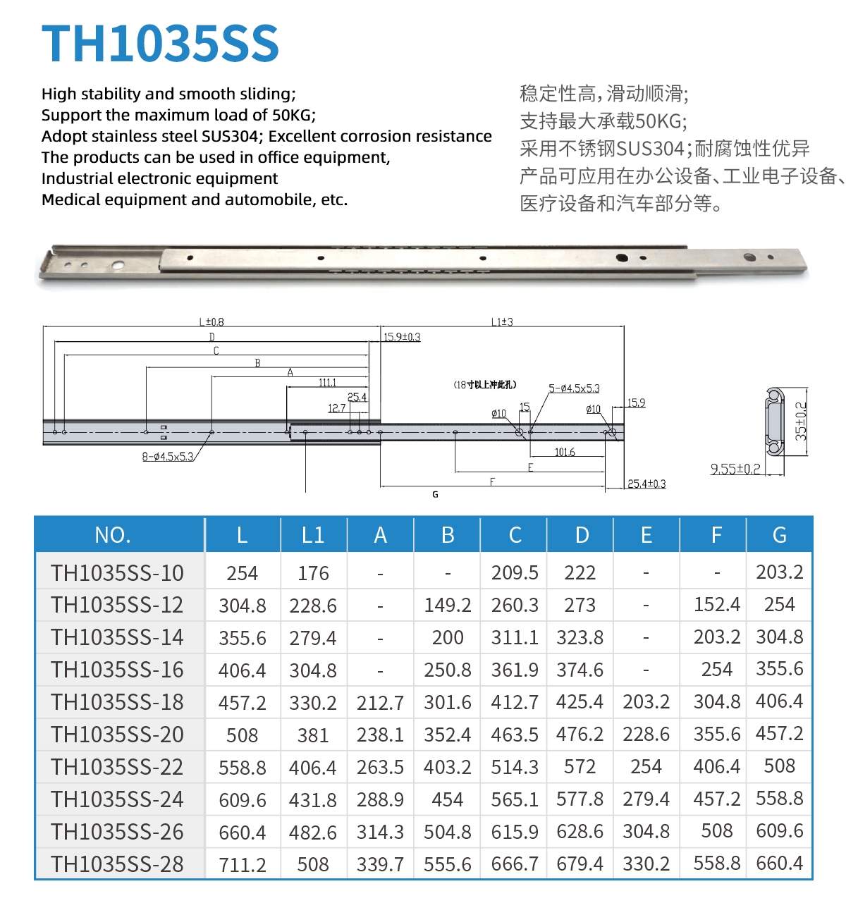 Stainless   steel 304 material 9.6mm thick 35mm wide light load slide rail Maximum load   30KG Used in office equipment, industrial electronics, medical equipment and   automotive parts