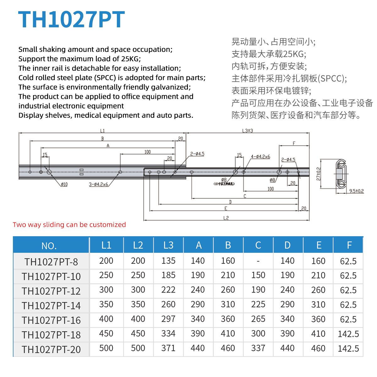 Cold rolled steel 304 material 9.6mm thick 27mm wide light load slide rail maximum load 35KG Used in office equipment, industrial electronics, medical equipment and automotive parts