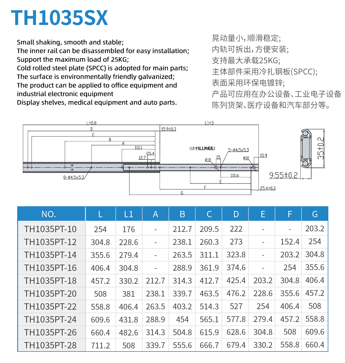 Cold rolled steel material 9.6mm thick 35mm wide light load slide rail maximum load 30KG Used in office equipment, industrial electronic equipment, medical equipment and automotive parts