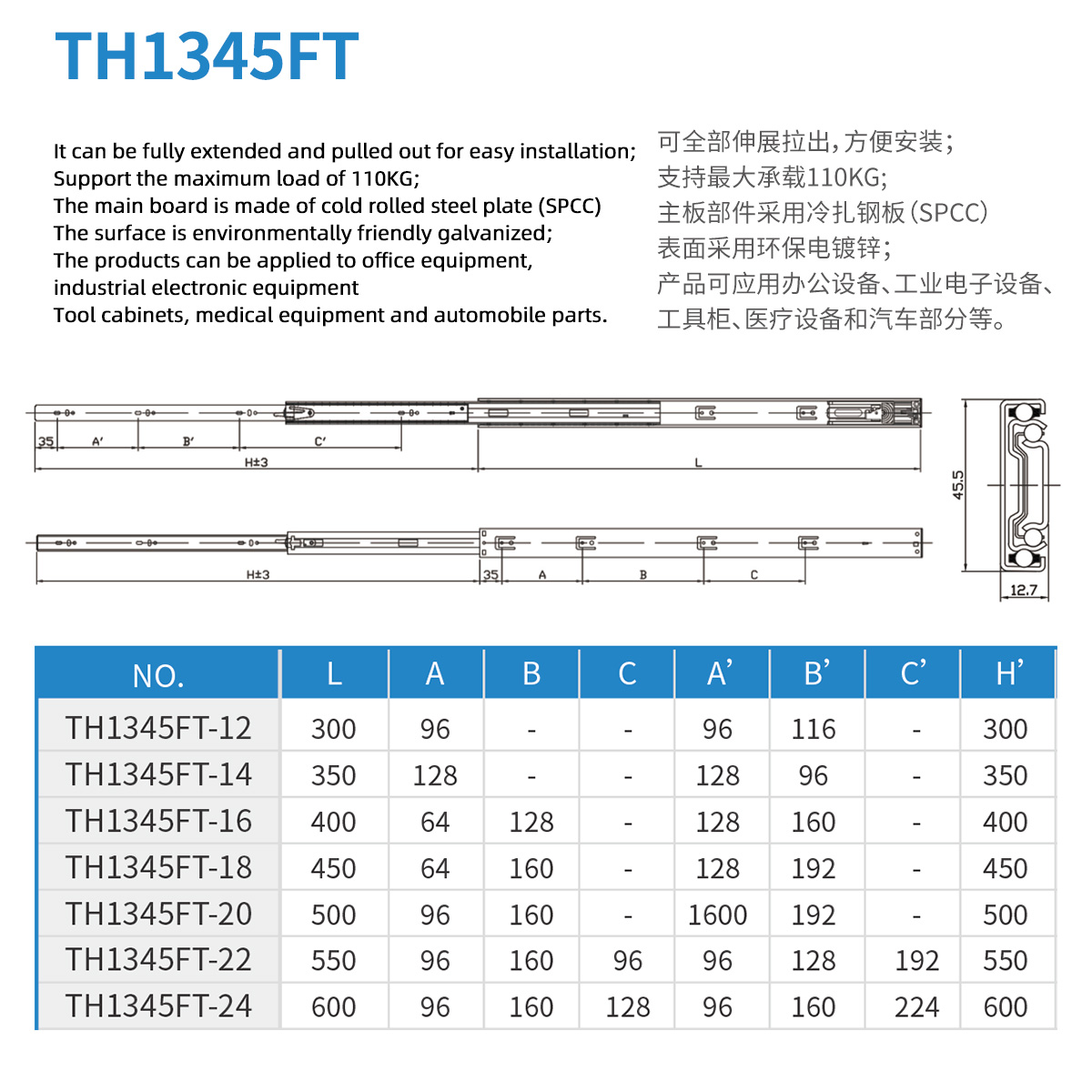 Cold rolled steel material 12.7mm thick 45mm wide rebound light load slide rail maximum load 45KG Used in office equipment, industrial electronics, medical equipment and automotive parts