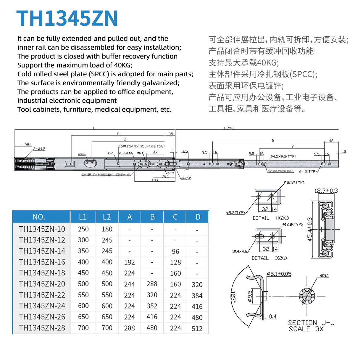 Cold rolled steel material 12.7mm thick 45mm wide damping light load slide rail maximum load 45KG Used in office equipment, industrial electronic equipment, medical equipment and automotive parts